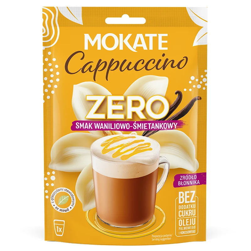 Delektuj się aksamitnym połączeniem aromatycznej wanilii i delikatnej śmietanki bez wyrzeczeń. Mokate Cappuccino ZERO o smaku Wanilii i Śmietanki to nowa odsłona kultowego napoju. Zachowuje swoją puszystą piankę i kremową konsystencję, a jednocześnie ma krótki, prosty skład. Pełnia smaku, bez kompromisów.