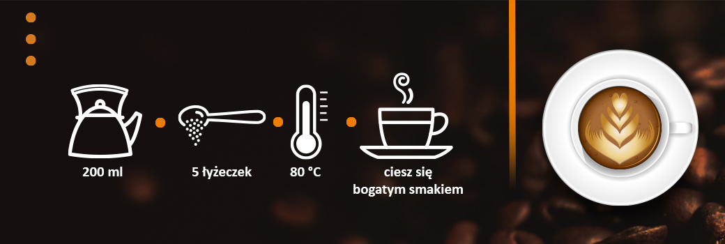 Wsypać około 5 łyżeczek (20g) Cappuccino do kubka. Zalać gorącą, ale nie wrzącą wodą (200ml, 80 stopni), jednocześnie mieszając.