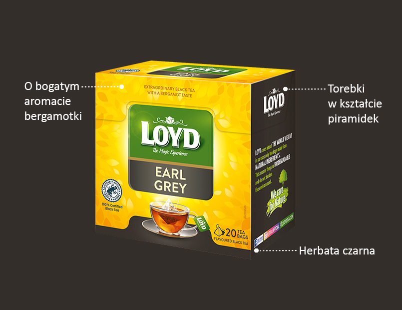 Tajemnica wyjątkowego smaku czarnych herbat LOYD kryje się w nieprawdopodobnie rygorystycznej selekcji herbacianego surowca. Tylko niewielki procent czarnych listków ma szansę trafić do herbacianego raju, czyli do słonecznych opakowań herbaty LOYD, które zawierają 20 lub 50 torebek. Jej wyjątkowy smak to bezsprzecznie zasługa specjalnie zaprojektowanych trójwymiarowych torebek w kształcie piramidek. Wykonano je z jedwabistego, absolutnie bezsmakowego naturalnego materiału. Dzięki temu podczas zaparzania uwalnia się wyjątkowy bukiet smaków i aromatów, którym możesz cieszyć się w każdej filiżance herbaty.