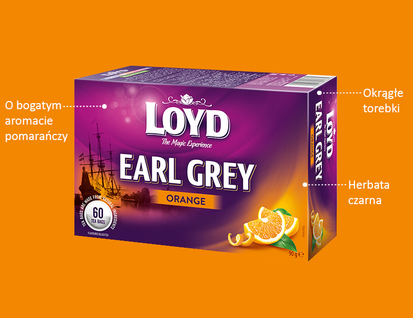 LOYD Earl Grey Orange to mieszanka herbat czarnych zamknięta w wygodne okrągłe torebki ekspresowe, która swój głęboki smak zawdzięcza aromatowi pochodzącemu z skórki pomarańczy bergamotki. Dodatkowa pomarańcza zapewnia w tej linii herbat jeszcze szlachetniejszy bukiet smaków.