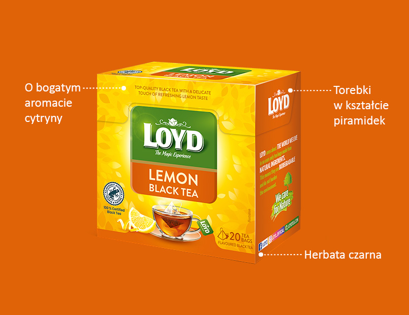 Tajemnica wyjątkowego smaku czarnych herbat LOYD kryje się w nieprawdopodobnie rygorystycznej selekcji herbacianego surowca. Tylko niewielki procent czarnych listków ma szansę trafić do herbacianego raju, czyli do słonecznych opakowań herbaty LOYD, które zawierają 20 lub 50 torebek. Jej wyjątkowy smak to bezsprzecznie zasługa specjalnie zaprojektowanych trójwymiarowych torebek w kształcie piramidek. Wykonano je z jedwabistego, absolutnie bezsmakowego naturalnego materiału. Dzięki temu podczas zaparzania uwalnia się wyjątkowy bukiet smaków i aromatów, którym możesz cieszyć się w każdej filiżance herbaty.