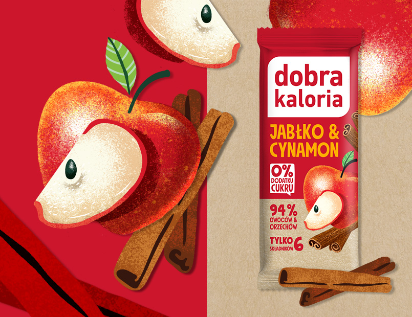 Składniki: daktyle suszone (62 %), jabłka suszone (14 %) (zawierają siarczyny), orzechy nerkowca (11 %), rodzynki, chrupki zbożowe (mąka kukurydziana, mąka ryżowa), cynamon (0,8 %). Może zawierać inne orzechy, orzeszki ziemne, nasiona sezamu, zboża zawierające gluten oraz pestki owoców lub ich fragmenty. Bez dodatku cukrów. Zawiera naturalnie występujące cukry.
