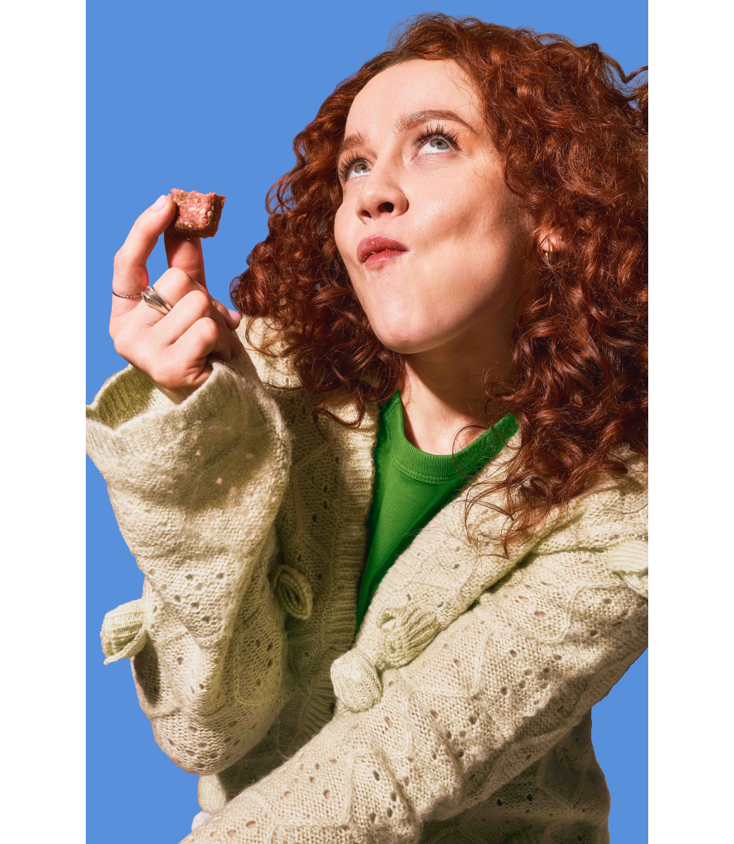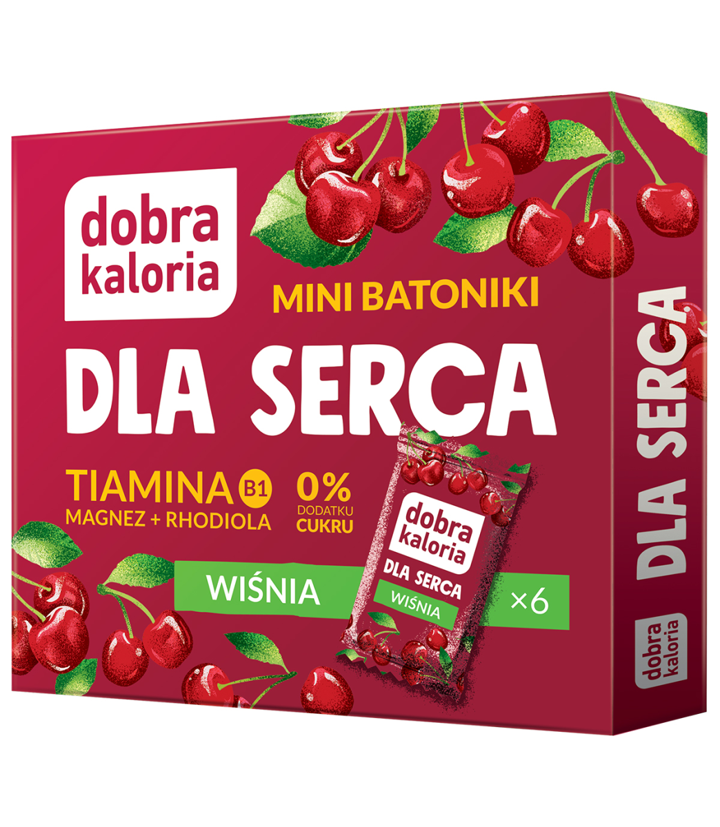 Pysznie wiśniowy baton z nutą orzeszków ziemnych i słonecznika kryje w sobie składniki, które robią więcej niż tylko dobrze smakują. Tiamina (B1) i magnez wspierają prawidłową pracę serca i układu nerwowego, a ekstrakt z różeńca górskiego pomaga radzić sobie ze zmęczeniem i codziennym stresem. Słodycz pochodzi wyłącznie z daktyli i wiśni - bez dodatku cukru. Wiśnie są soczyste, aromatyczne i zachowują naturalną kwaskowatość, przełamując słodycz daktyli. Troska o serce zaczyna się od drobnych codziennych wyborów… czasem od batonika, który smakuje tak dobrze, że trudno uwierzyć, iż jest zdrowy. Wraz z innymi batonami „do zadań specjalnych” tworzy serię, w której każdy ma swoją supermoc - od pobudzenia, przez wsparcie odporności, po troskę o jelita.