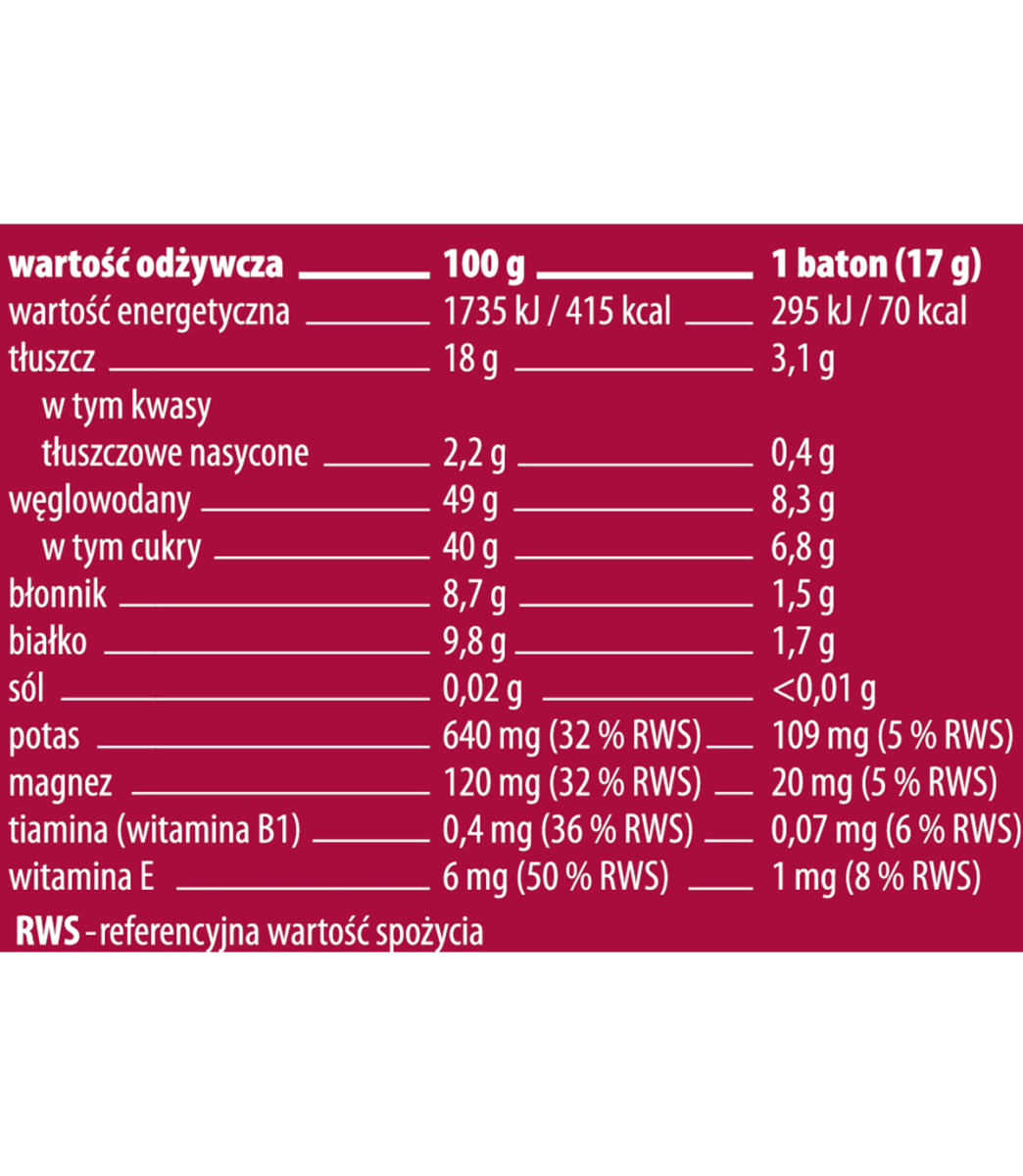 Składniki: daktyle suszone (50 %), orzeszki ziemne prażone, nasiona słonecznika, wiśnie suszone (8 %), siemię lniane, zagęszczony sok jabłkowy, sok wiśniowy w proszku (1 %), naturalny aromat wiśniowy z innymi naturalnymi aromatami, sok z buraka w proszku, ekstrakt z różeńca górskiego (0,3 %) (Rhodiola rosea L.). Produkt może zawierać orzechy, nasiona sezamu, mleko i zboża zawierające gluten. Uwaga: Produkt Może zawierać pestki owoców lub ich fragmenty. Bez dodatku cukrów. Zawiera naturalnie występujące cukry.
