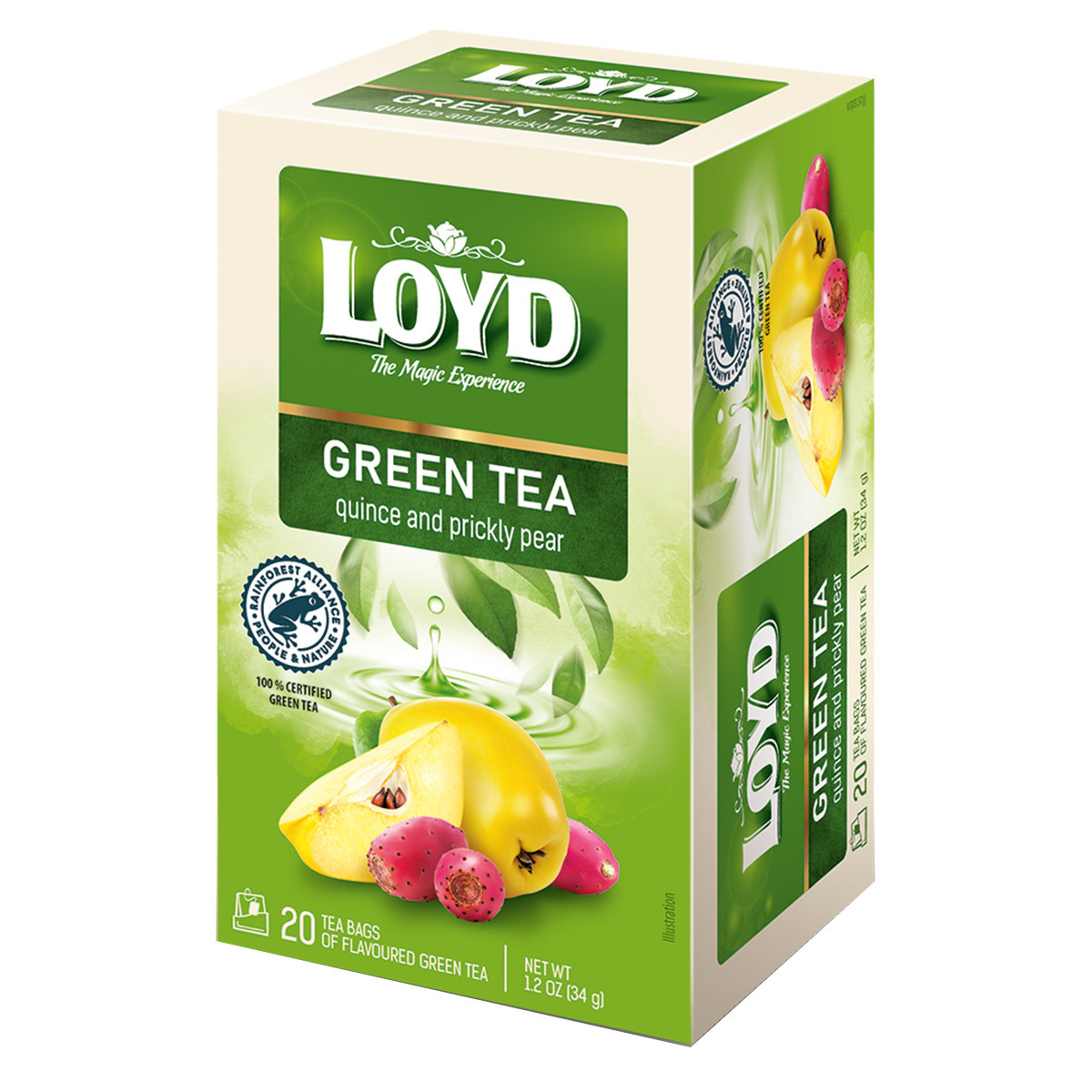 EN FLAVOURED GREEN TEA WITH QUINCE AND PRICKLY PEAR FLAVOUR IN TEA BAGS.