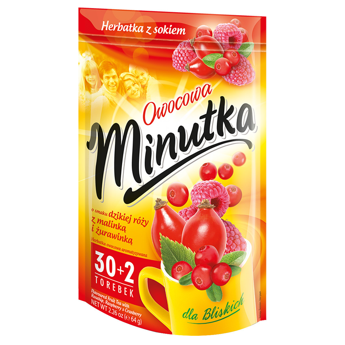 This fruit tea is made using a blend of rosehip, cranberry and raspberry juice. The combination of the distinctive flavour of rosehip, refreshing cranberry and sweet raspberry gives the tea a refined and deep flavour. This delicious and aromatic infusion is perfect for quenching your thirst on hot days, and when served warm on cooler days, it warms you up. It is packed in individual tea bags and a resealable ‘string’ pack, which guarantees long-lasting freshness. The absence of theine in Minutka fruit teas makes them a good choice for children too.