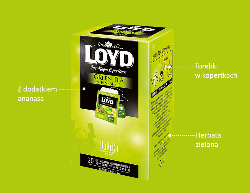 Linia LOYD HORECA to oferta herbat wysokiej jakości dedykowanych gastronomii oraz hotelarstwu. Specjalnie wyselekcjonowane herbaty oraz smaki gwarantują zadowolenie najbardziej wymagającego Klienta. Każda torebka herbaty zapakowana jest w kopertę z metalizowanej folii o wysokiej barierowości, co bezpośrednio przekłada się na utrzymanie świeżości produktu. Dodatkowo kartonik z dedykowaną perforacją pozwala na wygodne pobieranie pojedynczej torebeczki.