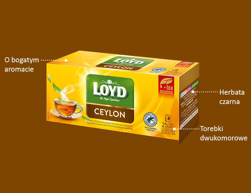Ceylon Sense od LOYD, to linia czarnych herbat pochodzących z wysokogórskich plantacji na Sri Lance o niepowtarzalnym, zmysłowym aromacie uzyskiwana ze specjalnie dobranych surowców nadających naparowi charakterystyczny, nasycony smak. Ta niezwykle sensualna linia została wzbogacona ekstraktem uzyskiwanym wprost u źródła smaku- z wnętrza najmłodszych herbacianych listków. Pozwól, by LOYD był Twoim przewodnikiem po krainie nieznanych doznań, gdzie smak herbacianego naparu jest uszlachetniony i wyrazistszy niż kiedykolwiek wcześniej. Daj się oczarować herbacianej esencji, bo LOYD to herbata z nutą magii.