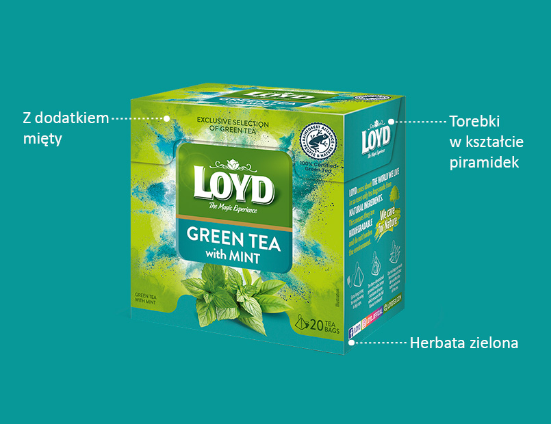 Zasmakuj w subtelnym połączeniu herbaty zielonej z orzeźwiającą miętą. Pozwól się oczarować, bo LOYD to herbata z nutą magii.