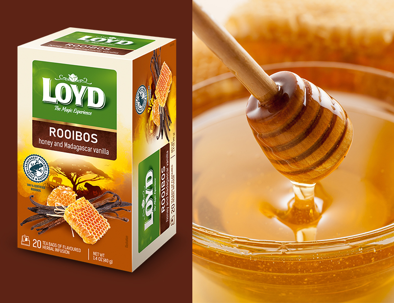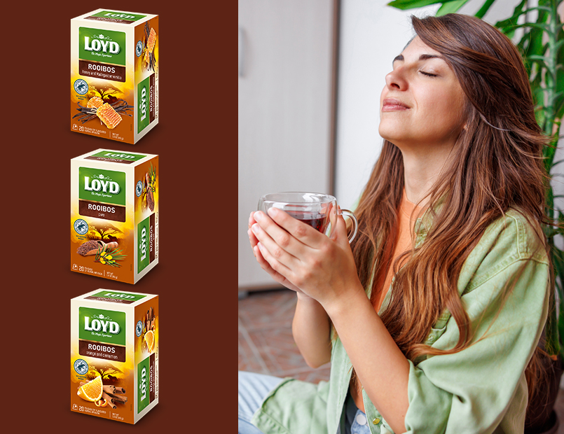 Herbatki Rooibos wywodzą się z Republiki Południowej Afryki, gdzie rośnie czerwonokrzew – wyjątkowy krzew, którego pocięte iglaste liście stanowią źródło niezwykłego naparu o czerwonawym kolorze i miodowo-słodkawym smaku. Jest on pozbawiony charakterystycznej dla herbaty goryczki, ze względu na znikomą zawartość garbników. Ponadto nie zawiera taniny, dlatego polecany jest dla dzieci i kobiet w ciąży lub matek karmiących piersią. Sekretem linii LOYD Rooibos są koperty – gwarancja pełni aromatu oraz najwyższej jakości produktu. Poczuj radość harmonii idealnie dostrojonych zmysłów i pozwól, by Rooibos Sense pomógł Ci odkryć magię we wszystkim, co Cię otacza. Daj się oczarować, bo LOYD to herbata z nutą magii.