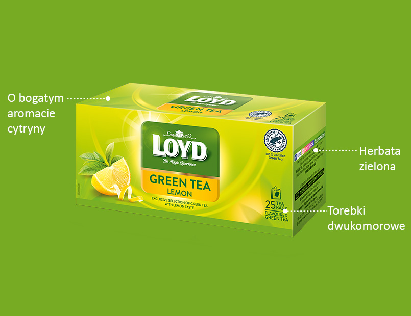 Herbata LOYD Green Tea Lemon to idealna propozycja dla osób ceniących sobie smak zielonej herbaty z soczystymi aromatami. Udało nam się połączyć to co najlepsze w zielonej herbacie oraz cytrynie i tak uzyskaliśmy wyjątkową mieszankę. Całość zamknięta w dwukomorowe torebki, pakowane w klasyczne kartoniki po 25 sztuk.