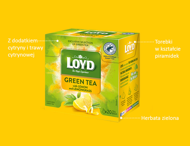 Rozkoszuj się starannie wyselekcjonowaną mieszanką długich liści zielonej herbaty z dodatkiem cytryny i trawy cytrynowej dającej delikatnie żółty napar o wyraźnie odświeżającym smaku. Pozwól się oczarować, bo LOYD to herbata z nutą magii.