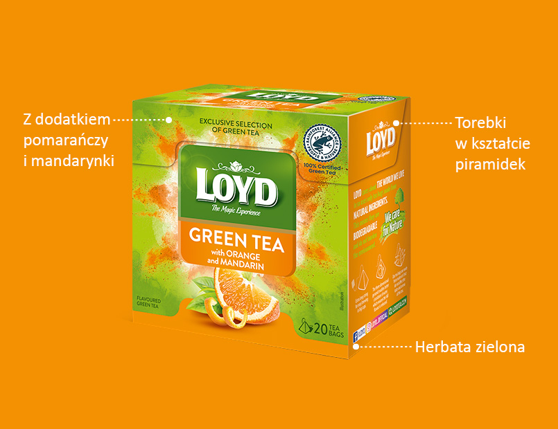 Zasmakuj w subtelnym połączeniu herbaty zielonej, wzbogaconym intensywną nutą soczystej pomarańczy i egzotycznej mandarynki. Pozwól się oczarować, bo LOYD to herbata z nutą magii.