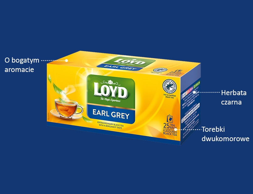 Czarne herbaty w linii Loyd charakteryzują się szlachetnym smakiem, który wynika z dbałości o dobór gatunków liści, jakie wykorzystujemy do produkcji. W serii czarnych herbat Loyd w torebkach dwukomorowych znajduje się także Intense Black Tea. Jeśli lubisz intensywny aromat i mocny smak czarnej herbaty spróbuj jej koniecznie. Herbata czarna, której filarem smaku jest charakterystyczny cytrusowy aromat bergamotki to propozycja dla miłośników herbaty Earl Grey.