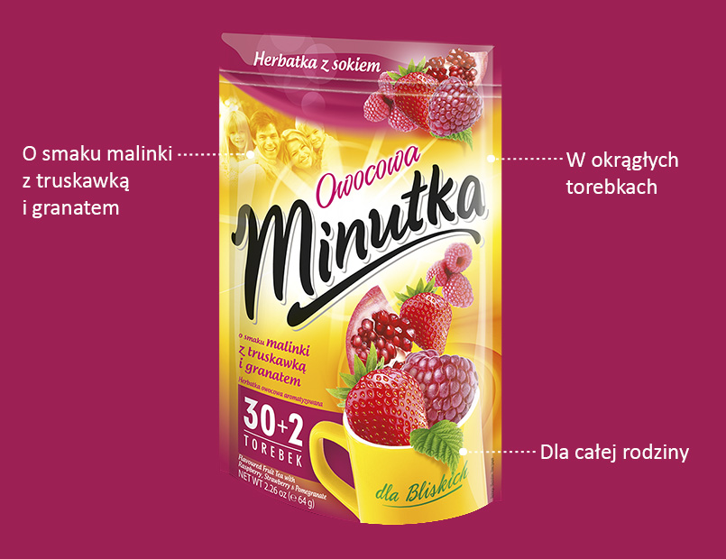 Minutka o smaku maliny, truskawki i granatu to zaskakujące połączenie popularnych owoców z egzotycznym akcentem. Oryginalna receptura wzbogacona została sproszkowanym sokiem owocowym, który dodaje naparowi świeżości i soczystości. Minutka już od lat doceniana jest przez polskie rodziny, jako idealny napój na co dzień, którym możesz dzielić się z Bliskimi.