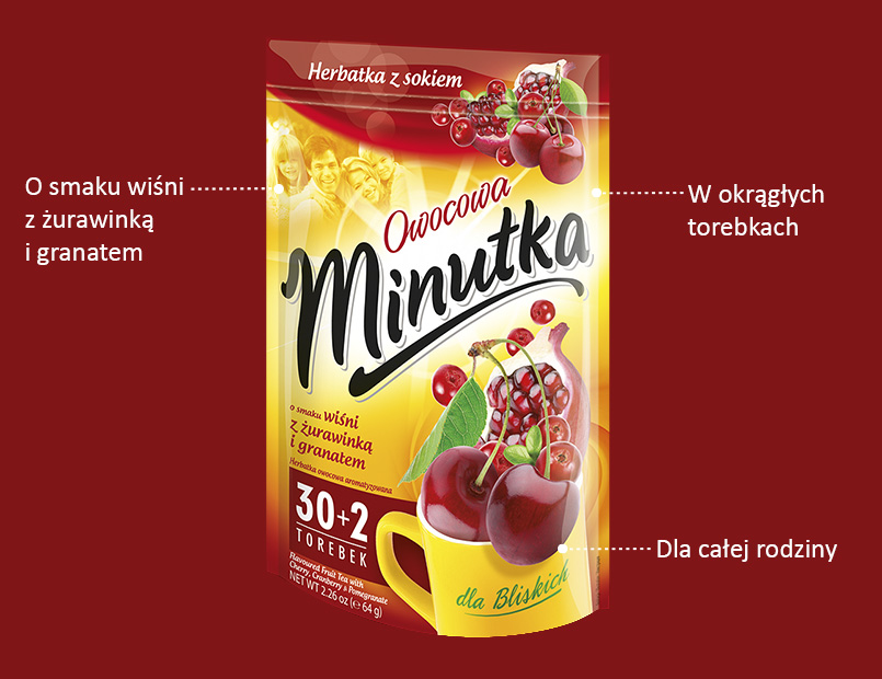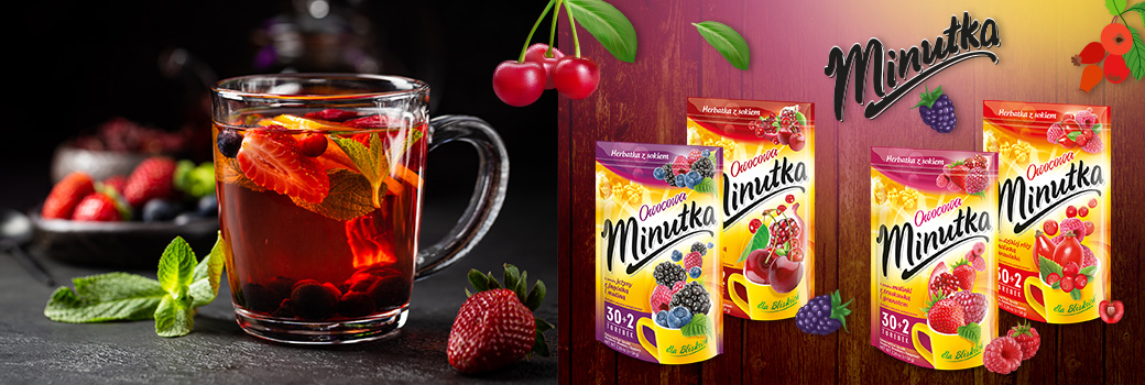 Herbatki owocowe to znakomita propozycja w każdej sytuacji: na rozgrzanie, gdy chłodno; po przestudzeniu świetnie orzeźwiają. Minutka o smaku wiśni z żurawiną i granatem to przepyszny smak przetworów z własnego sadu z egzotycznym akcentem. Wyjątkową świeżość i soczystość zapewnia dodatek sproszkowanego soku owocowego. Minutka już od lat doceniana jest przez polskie rodziny, jako idealny napój na co dzień, którym możesz dzielić się z bliskimi.