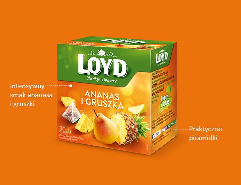 Herbatki owocowe LOYD w piramidowych torebkach zostały stworzone dla miłośników prawdziwie owocowych smaków, a przygotowany z nich napar uzyskuje głęboką barwę, wspaniały aromat i niezwykły smak.