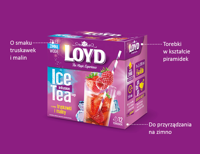 Herbatki owocowe na zimno w piramidkach Gdziekolwiek jesteś, wystarczy zimna woda i gotowe! To rozwiązanie dla osób chcących zrezygnować ze słodzonych napojów gazowanych, a jednocześnie nie lubią pić samej wody. Już przy użyciu jednej torebki herbatki Loyd można szybko przygotować zdrowy i smaczny napój o pysznym owocowym smaku. Wystarczy zanurzyć torebeczkę w butelce wody i poczekać aż uwolni orzeźwiający bukiet smaków pochodzący z wyjątkowej kompozycji owoców i ziół.