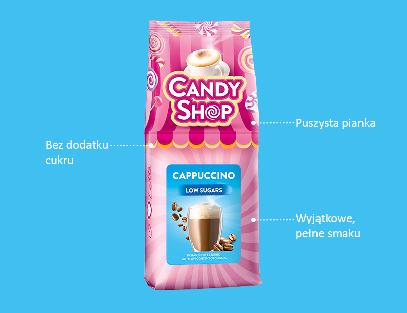 Candy Shop Low Sugars to aromatyczne cappuccino o zmniejszonej zawartości cukru.