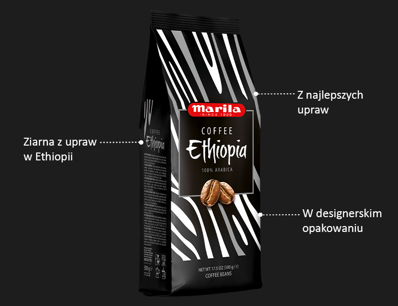Etiopia jest uważana za kraj, z którego kawa rozprzestrzeniła się na cały świat. Co więcej, jest uznawana za pierwowzór kawowca i często mówi się, że słowo kawa pochodzi od etiopskiej prowincji Kaffa, gdzie nadal hodują kawę. Ziarnista kawa uprawiana w Etiopii ma bogaty harmonijny smak i często aromat wina. Eksperci oraz roasterzy i bariści z całego świata plantacyjną kawę z Etiopii uważają jako jedną z najlepszych na świecie. W kawie ziarnistej Marila Ethiopia Single Origin znajdziesz wszystko co najlepsze w ziarnach z tego regionu- owocowość, przyjemna kwasowość, nuty czekolady i kwiatów. Przekonaj się na własnej skórze jak smakuje kawa z Etiopii i zakochaj się w niej już na zawsze.