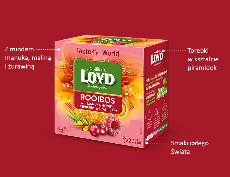 PL HERBATKA ZIOŁOWO-OWOCOWA AROMATYZOWANA Z ROOIBOSEM, DODATKIEM MIODU MANUKA, O SMAKU MALINY I ŻURAWINY W TOREBKACH DO ZAPARZANIA.