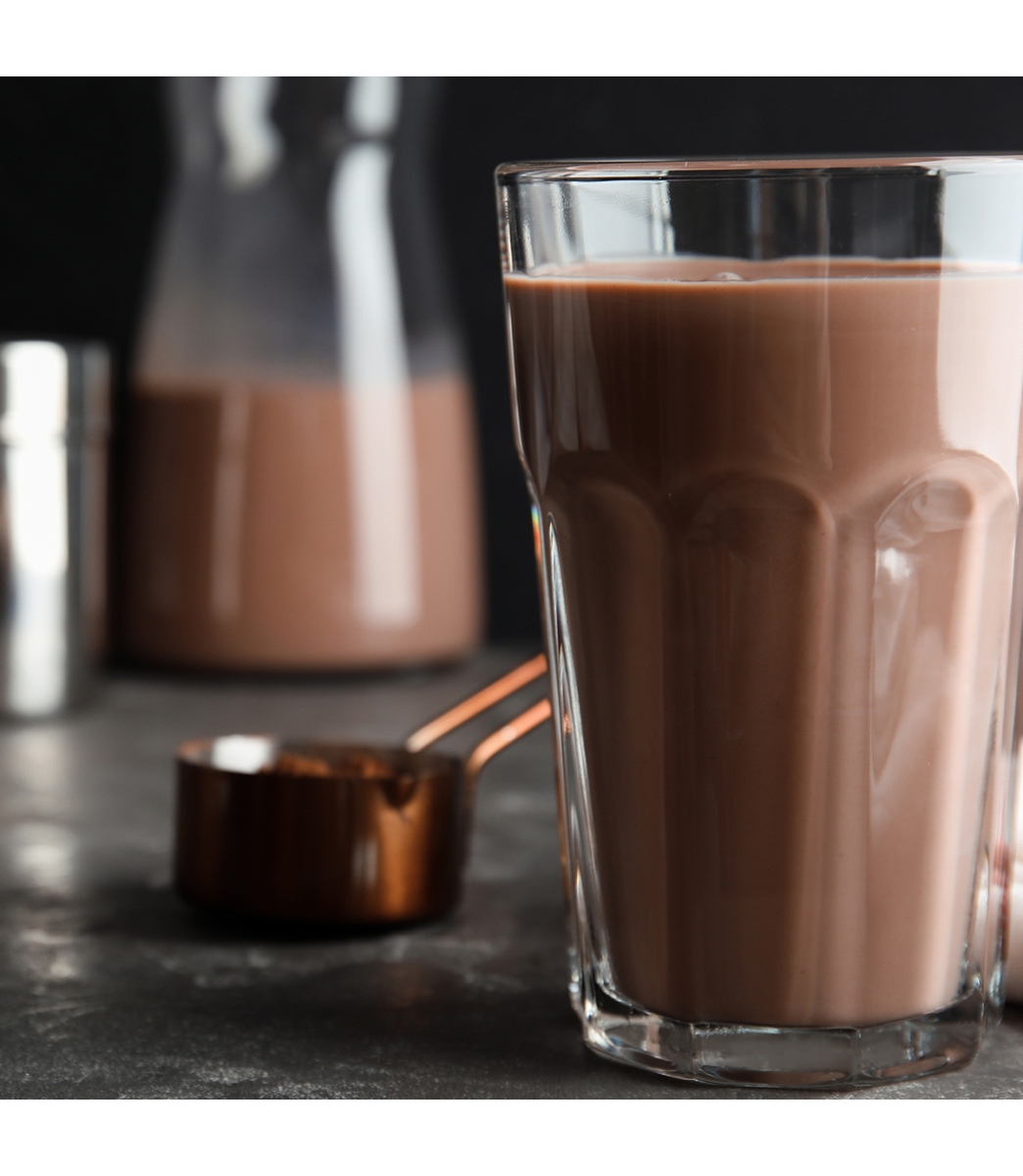 Składniki: czekolada do picia o obniżonej zawartości tłuszczu (35,5 %) (cukier, kakao w proszku o obniżonej zawartości tłuszczu), permeat serwatkowy (z mleka), cukier, serwatka w proszku (z mleka), syrop glukozowy, olej kokosowy, sól, aromaty, skrobia, stabilizatory: fosforany potasu, cytryniany sodu; białka mleka, substancja zagęszczająca: guma celulozowa.