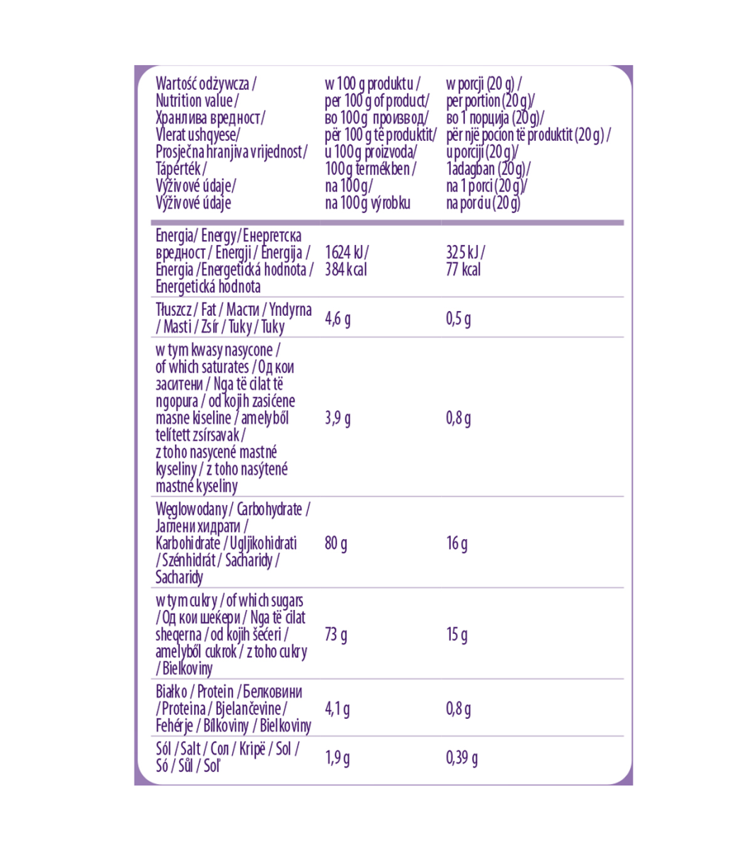 Składniki: czekolada do picia o obniżonej zawartości tłuszczu (35%) (cukier, kakao w proszku o obniżonej zawartości tłuszczu), permeat serwatkowy (z mleka), cukier, serwatka (z mleka) w proszku, syrop glukozowy, olej kokosowy, sól, aromaty, skrobia, emulgatory: mono- i diglicerydy kwasów tłuszczowych; substancja przeciwzbrylająca: dwutlenek krzemu, stabilizatory: cytryniany sodu, fosforany potasu; białka mleka, substancja zagęszczająca: guma celulozowa, belgijska czekolada w proszku (0,1%). Produkt może zawierać soję i zboża zawierające gluten.