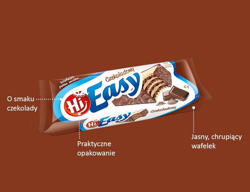 Wafelki HI EASY to wafelki, które powstały w trosce o najwyższą jakość produktu! Sprawdzą się w podróży, w pracy a także przy popołudniowej kawie! To doskonała propozycja dla fanów klasycznych rozwiązań. Idealnie kruchy wafelek, pyszna czekolada to prawdziwa rozkosz dla podniebienia